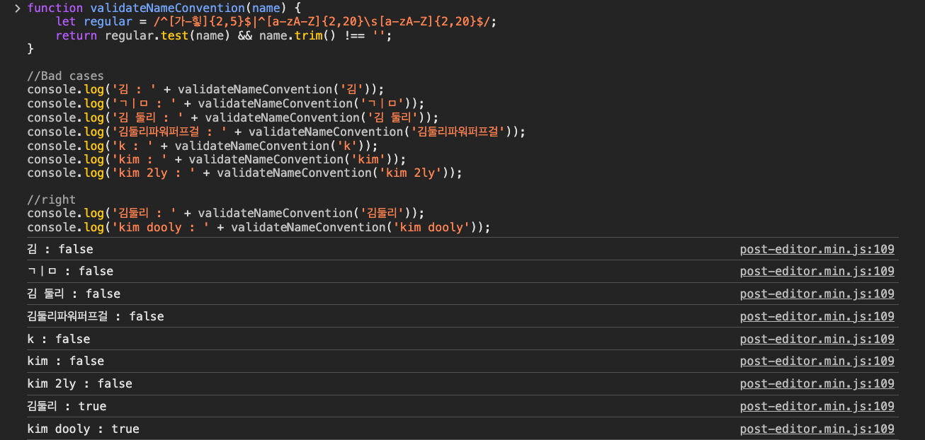 어렵고 복잡하기로 절대 빼놓을 수 없는 정규식을 이용해서 이름과 휴대전화 번호의 유효성을 검증하는 함수를 구현해 보았습니다.