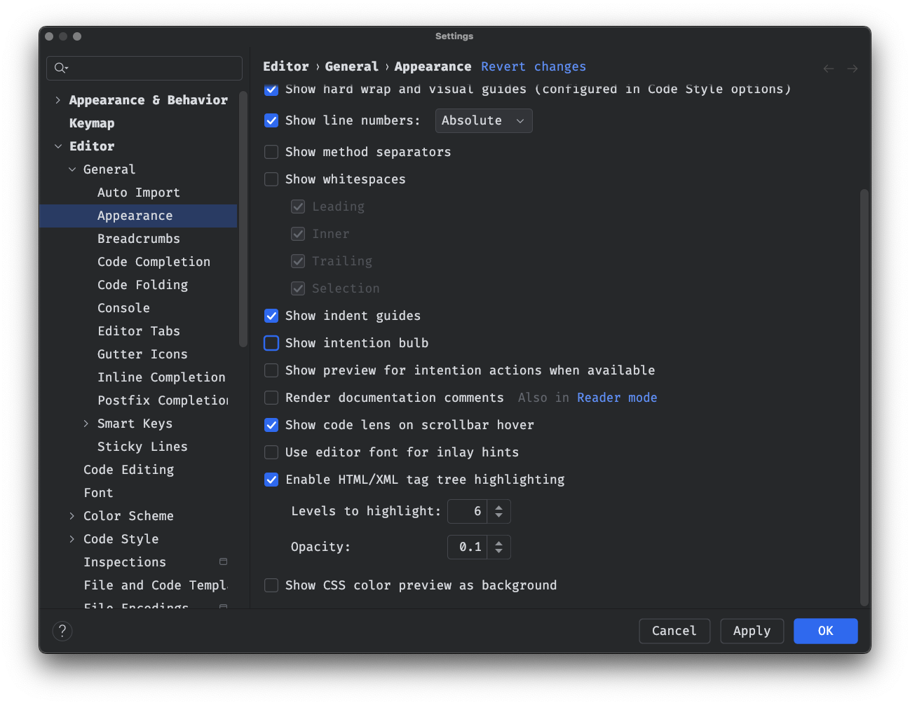 - 이 옵션을 끄면 전구 아이콘이 에디터 왼쪽에 표시되지 않습니다.