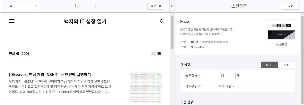 "티스토리 > 블로그 관리 > 꾸미기 > 스킨편집" 메뉴에 진입합니다.