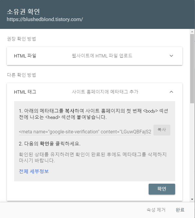 다시 구글 서치 콘솔 화면으로 돌아가 확인 버튼을 눌러주면