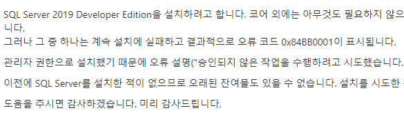 [SQL Server] SQL Server 설치 에러 0x84BB0001 본문